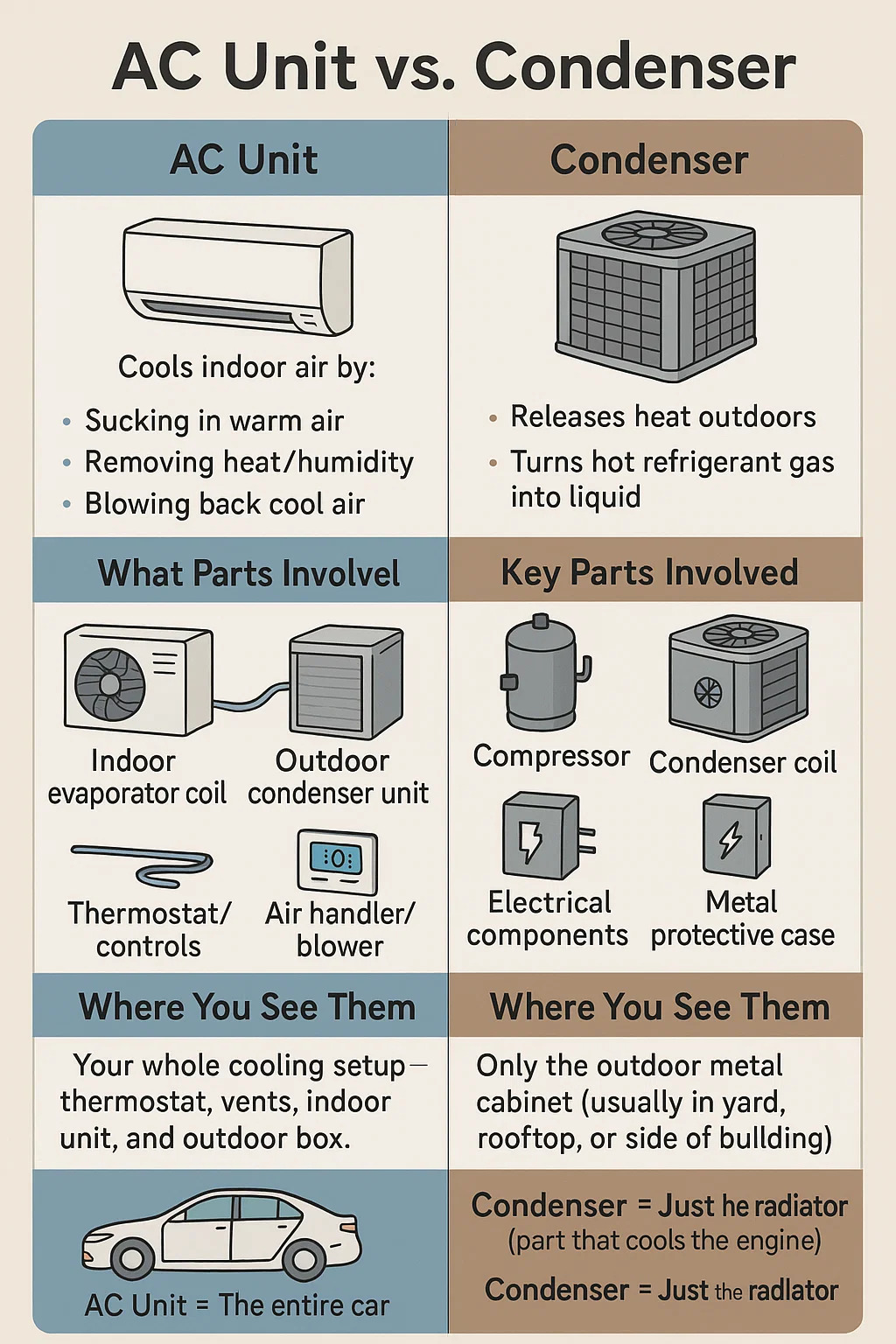 AC 장치: 집이나 건물을 냉각시키는 전체 시스템을 말합니다. 여기에는 함께 작동하는 모든 부분이 포함됩니다.